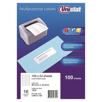 Unistat Multi-Purpose Labels | Sticker Labels | The Stationery Shop Description. Unistat Multi-Purpose Labels offer you a cost effective, software-supported solution for your labelling needs. Use Unistat labels in your laser printer, inkjet printer or copier. Select from a full range of mailing and parcel label sizes. Other options - Labels. Follow us on Social Media. The Stationery Shop started business in 1993.