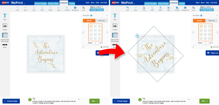 Rotate Text & Graphics on Your Product Labels - Avery Follow the previous step to rotate the new text or images as you add them. 3. Upload your own artwork In the top toolbar, select Upload Your Complete Design. A popup will appear. Select your desired orientation. Drag & drop or upload your artwork. Design diagonal or diamond shapes Edit One / Edit All - Each Label Different / Every Label the Same Call Us: (800) 462-8379 Edit One / Edit All - Each Label Different / Every Label the Same When starting a new project - the Sheet Navigator (located to the right of the screen on Step #3) will automatically be selected to the Edit All feature. How To Add Fonts to Avery Design and Print | The Serif Step 1: On the Avery website, click on the Print & Design tab on the right side. Step 2: Click on the Sign Up button and fill the form with the necessary details. Step 3: The account is created, and you can now start customizing the label. How to use Avery Design & Print label templates - Working with Text If you ever need to print your own labels, then you need to know about Avery Design & Print label creator software. We have created a new series of videos to...